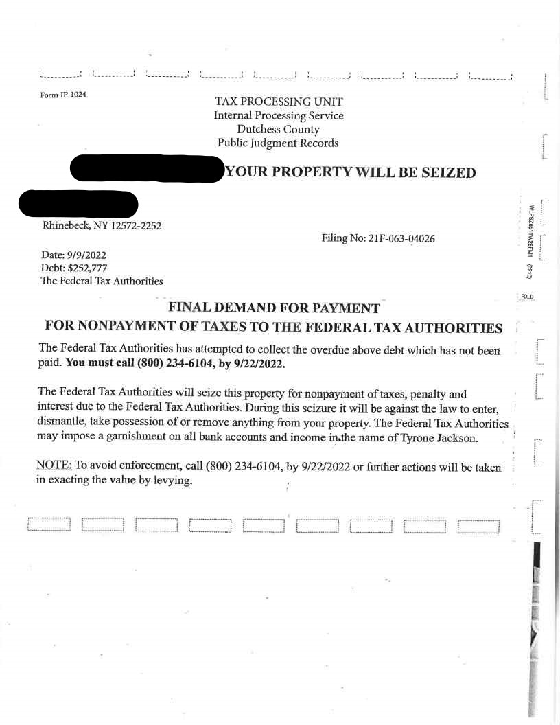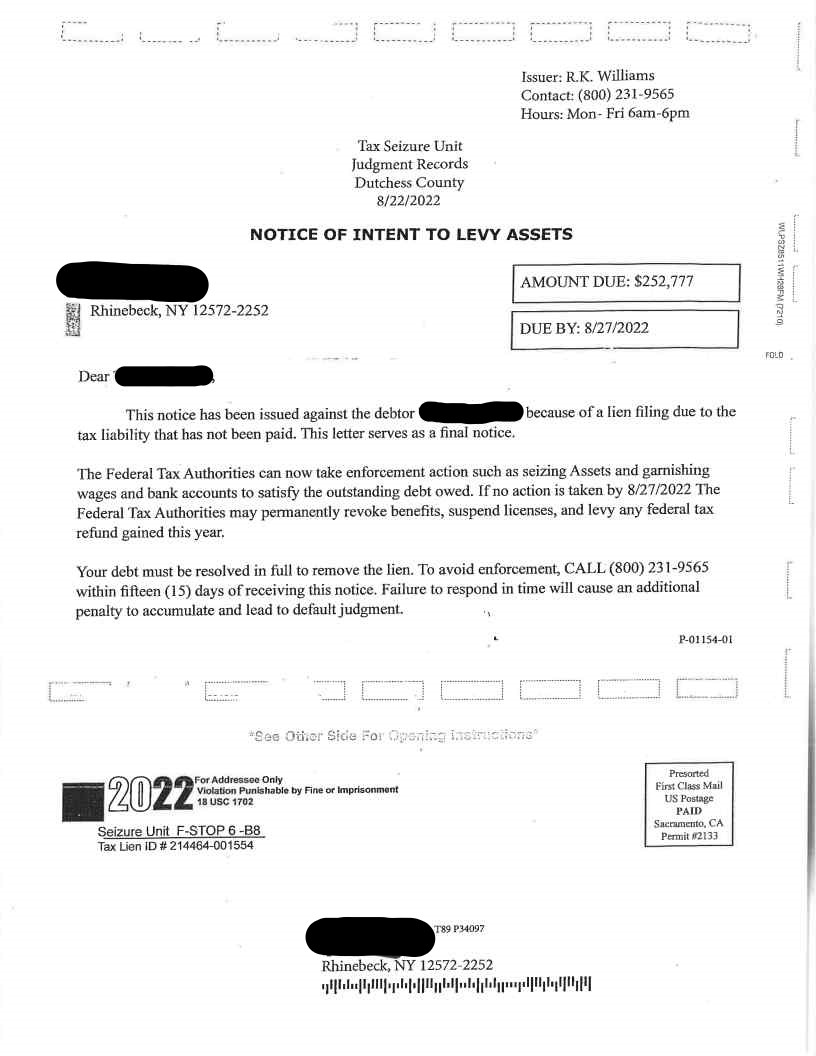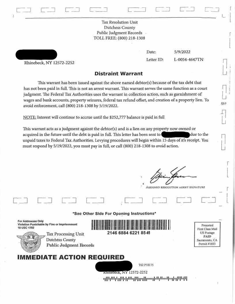 There are Scam Letters circulating throughout New York State claiming to be from the Tax Resolution Unit from your Counties Public Judgment Records department. These letters claim that taxes are due as a "Distraint Warrant" has been issued. Do not respond to these letters, however they can be reported to the NYS Tax Department by phone 518-451-1566 or email dtfoia@tax.ny.gov