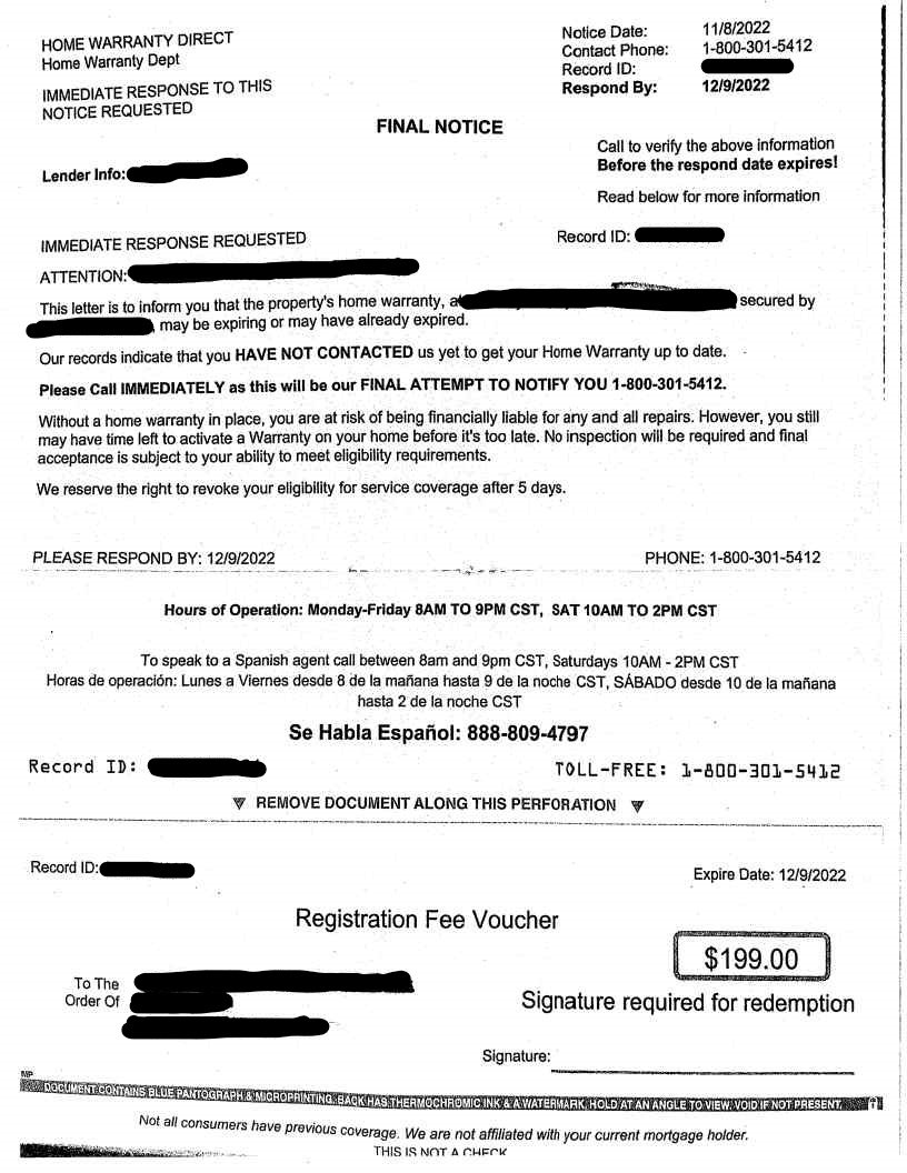Below is the link to a letter that was received by a constituent of Jefferson County. This letter is demanding payment to extend the properties Home Warranty. If you receive a letter like this do not call the number and give your payment information over the phone as this is a scam.