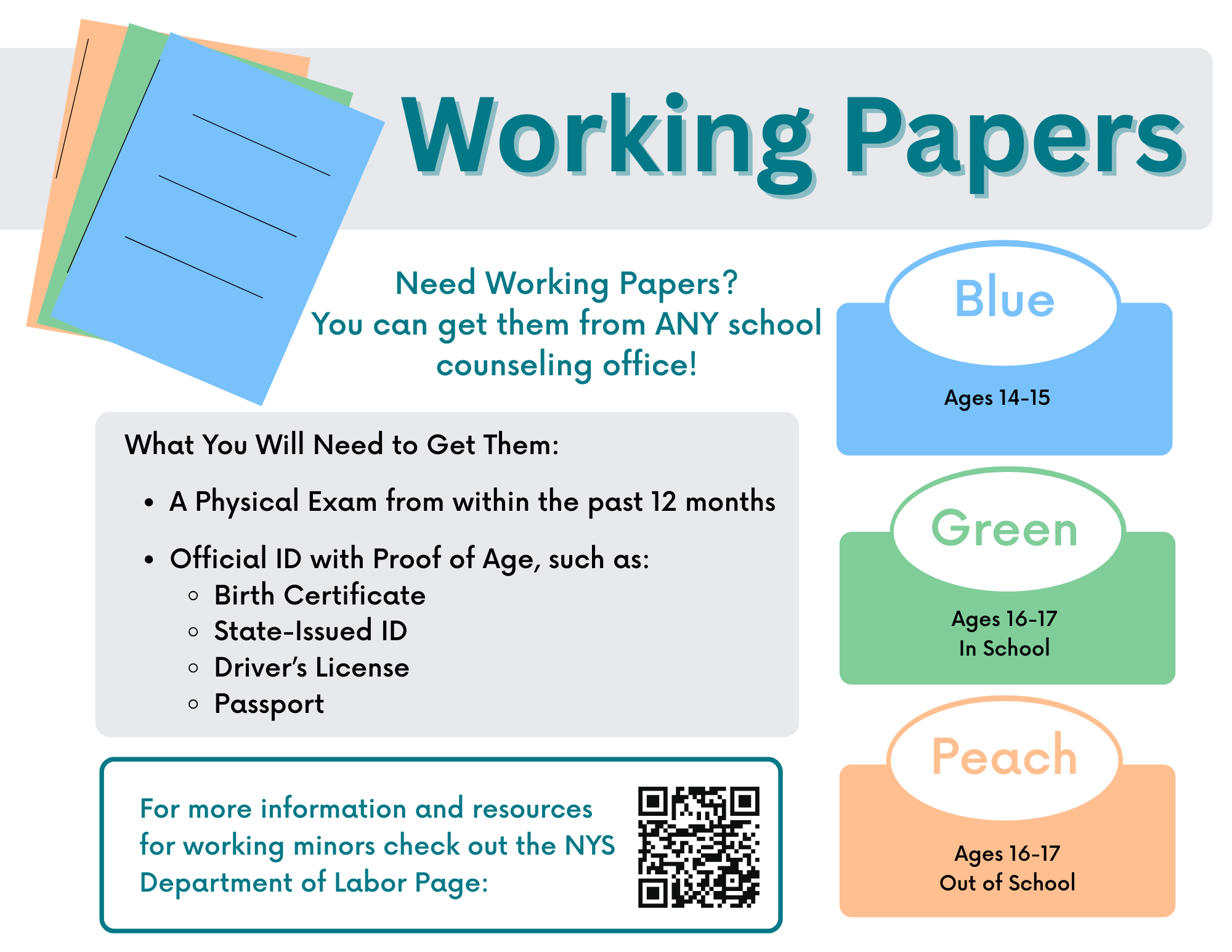 If you are under age 18, you need working papers in order to have a job in New York State. Please contact the counseling office of the school district you live in to schedule an appointment to fill out an application and provide documentation to the school counselor. You will also need to have a physical or provide proof that you have had a physical within the last year.