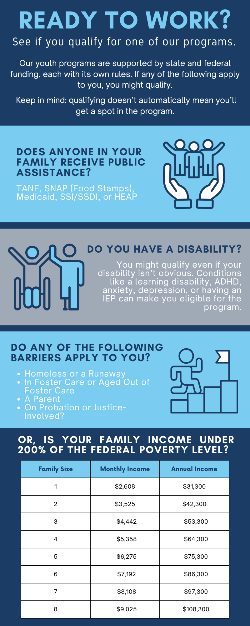 Youth & Young Adult Employment Programs are available for those under the age of 25 who meet eligibility qualifications. Our Year-Round program runs continuously while our Summer program runs from July to August Click Here for an Application!