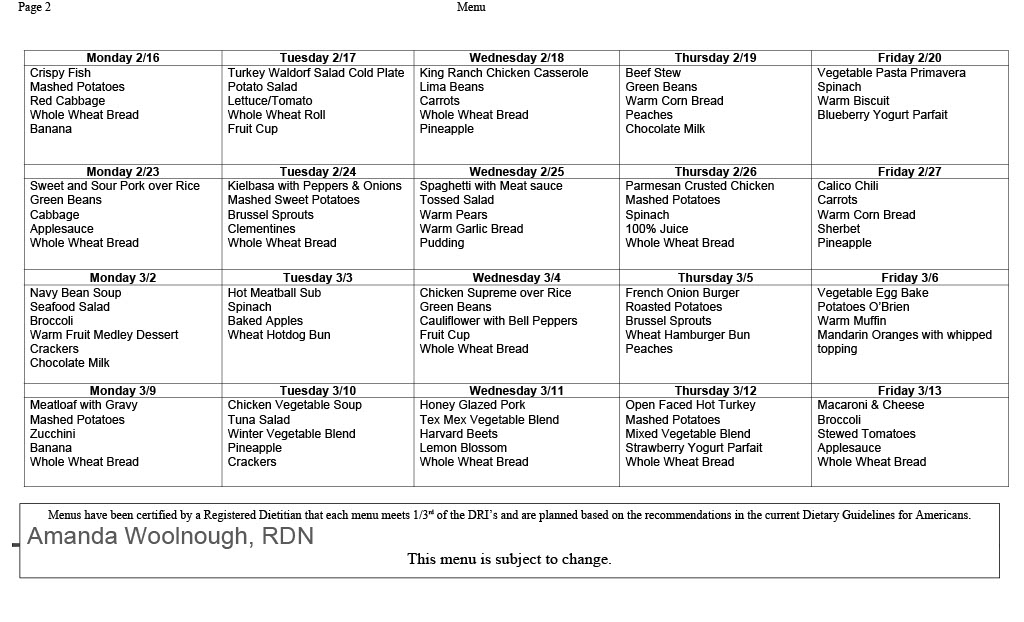 Home Delivered and Community Meal Site Menus