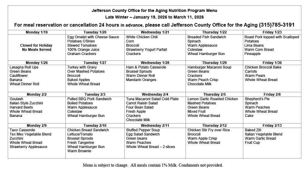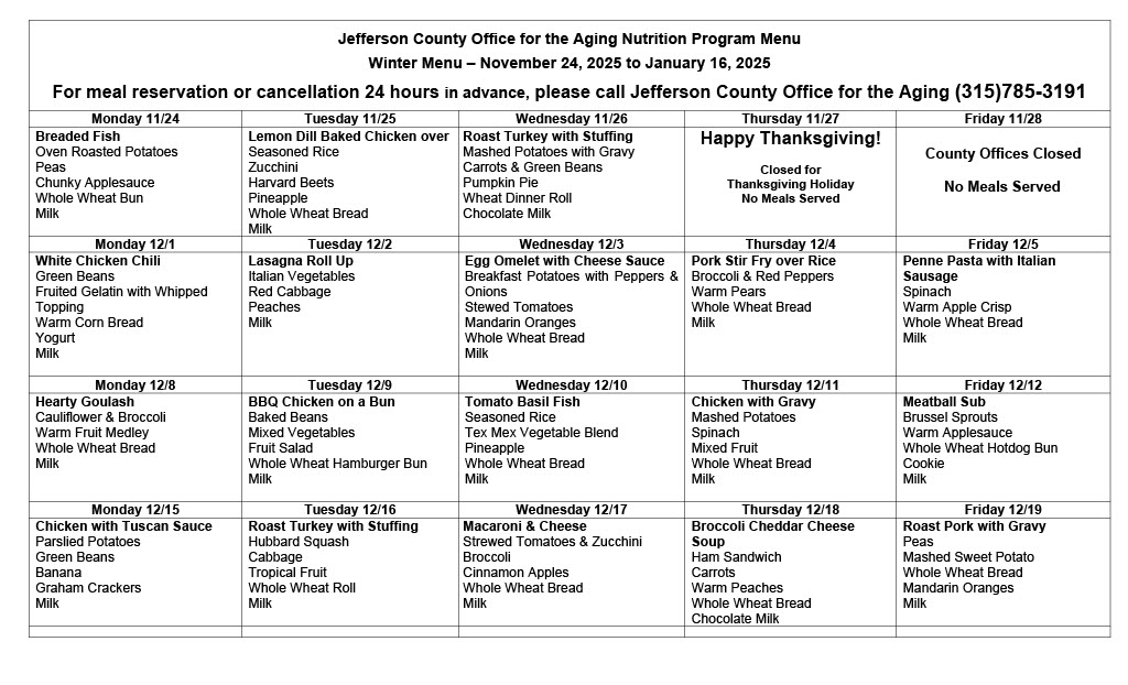Noontime meals are also available for persons 60 and over in a friendly group setting at sites throughout the county. Frequent social and educational programs occur at the sites. Reservations may be made at the selected site or by calling Prestige Services at 315-686-4440 the day before you want the meal.